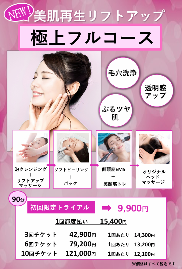 肌に優しいクレンジングで透明感が増し、リフトアップに効果的な側頭筋のEMSを含めた美顔筋トレ、最後にヘッドマッサージで血行促進させるフルコースのメニューです。